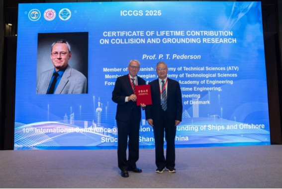 大会主席朱凌教授邀请葡萄牙工程院院士、里斯本大学Carlos Guedes Soares 教授介绍了丹麦技术科学院、中国工程院以及挪威技术科学院院士Preben Terndrup Pedersen教授在船舶碰撞与搁浅领域耕耘至今的成就,并邀请中国工程院吴有生院士为Pedersen院士颁发了“碰撞与搁浅研究终身贡献奖”。